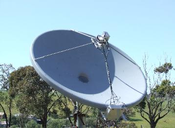 | At the heart of my microwave EME operations is my 3.7m Joysat dish. This is a mesh covered dish and the spacing of the mesh is no wider than 4mm. As such even on 10 GHz there theoretically should be little difference between it and a solid dish. In practice I seem to be down a little bit from the theoretical gain on 10 GHz but have worked stations with as little as 10 W and a 2.4m dish. |