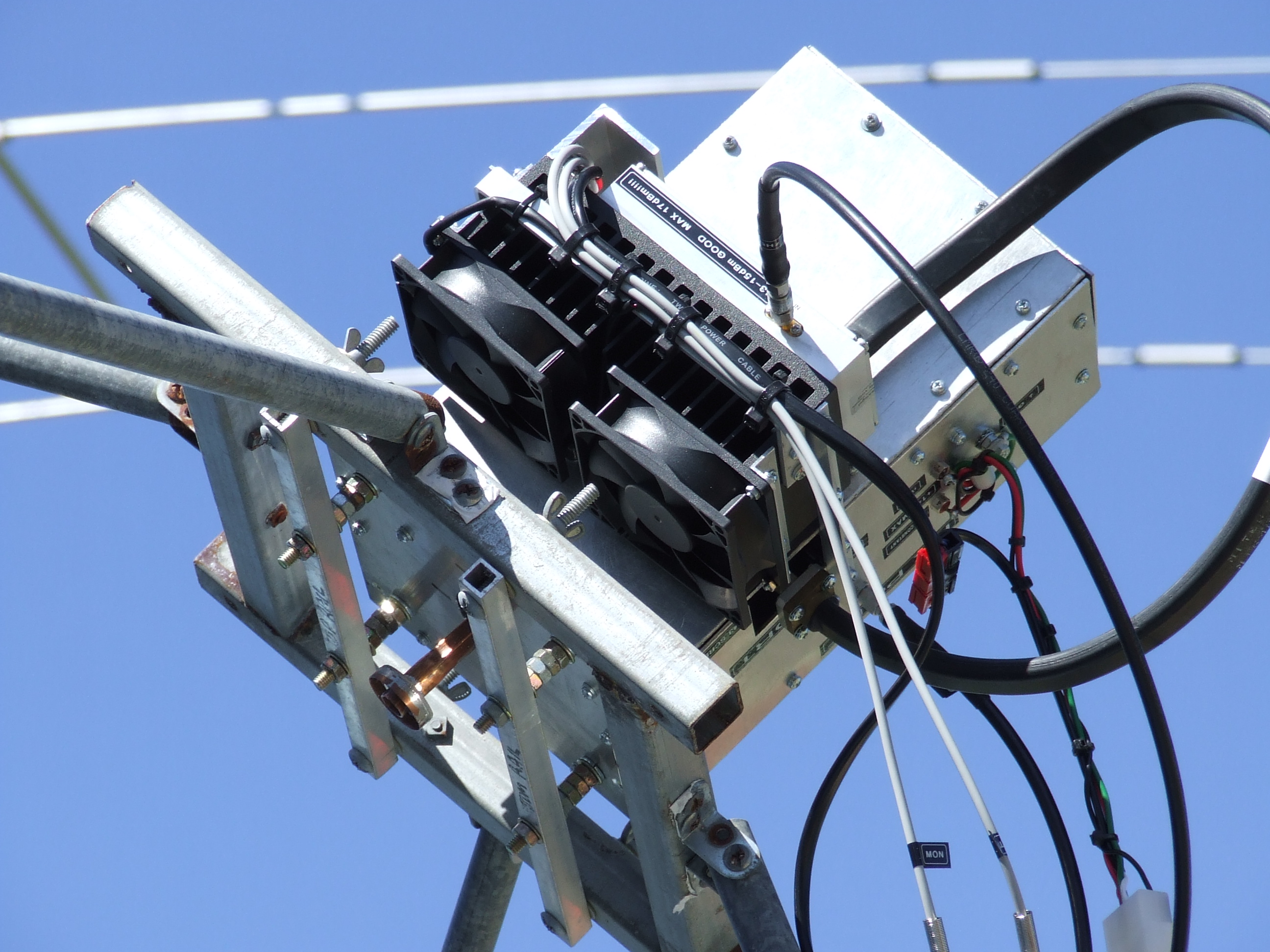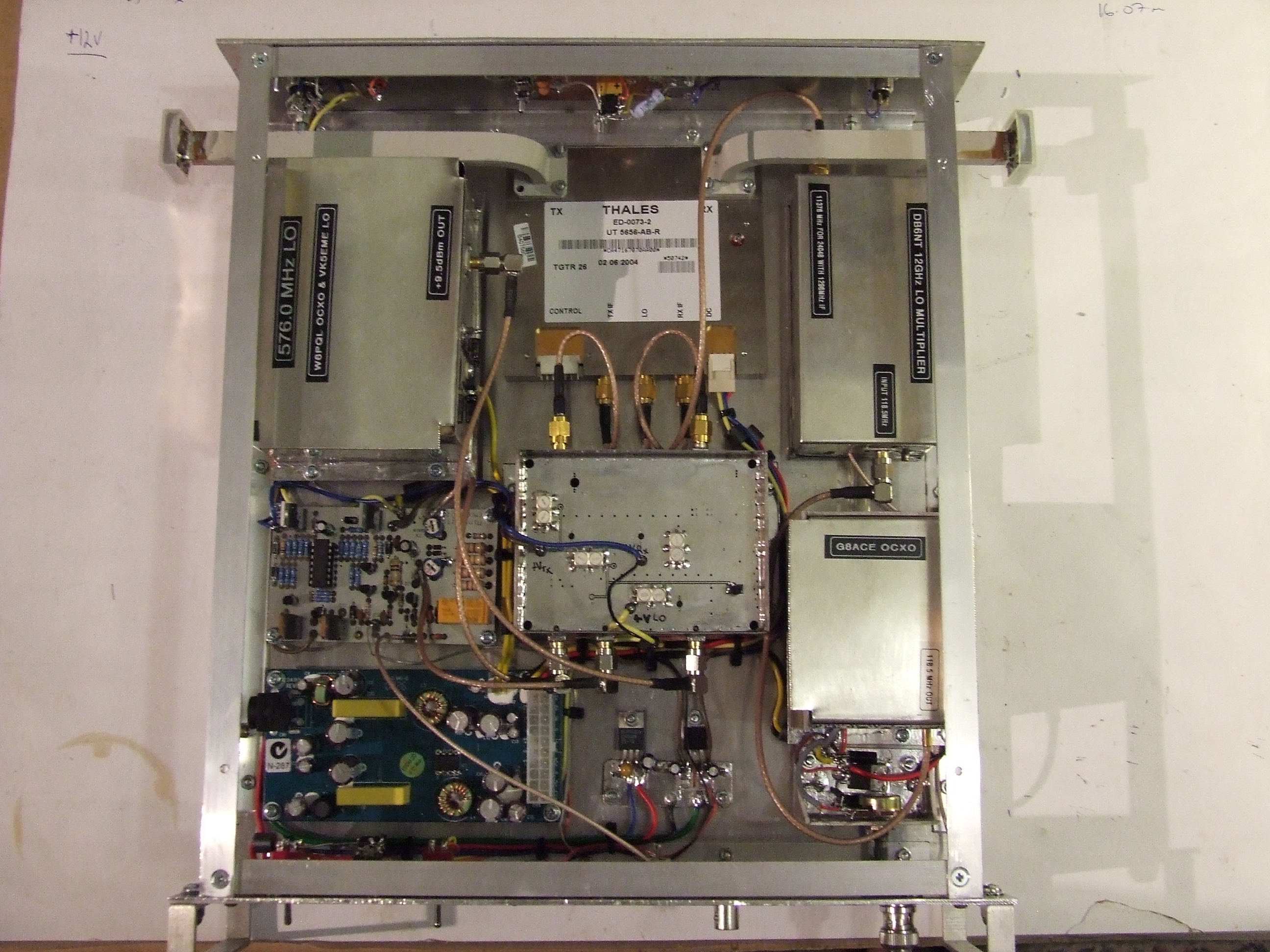 | EQUIPMENT ON 24 GHz EME • 2.4 m Solid dish (Andrews) • 11.5 W Kuhne SSPA (10 W at feed) short WR42 flexible W/G to W/G Switch (~0.5dB loss) • Feed: Super VE4MA choke flange with Circular to rectangular transition (WR42) • W/G switch: “EVENTS HORIZON” • LNA @ feed Kuhne 1.5dB NF 27 db gain + DB6NT design (homebrew) NF= Max 2.0dB Gain = 11.5dB Total gain is 38.5dB in “feed box” • LMR240 with Radiall 18GHz connectors for short run on Tx and Rx from “feed box” to transverter • Transverter = Thales 26 GHz units running 1296 MHz IF. Then 2nd down-conversion to 144MHz IF. • Kuhne 24 GHz W/G filters on Rx and Tx ports of Thales unit. (Absolutely necessary due to very poor image rejection ~4dB only with 1296 MHz IF) Perfomance: • Best Moon noise measured at 2.2dB At low path loss and low levels of libration my echoes are audible. |