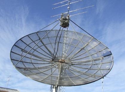 | At the heart of my microwave EME operations is my 3.7m Joysat dish. This is a mesh covered dish and the spacing of the mesh is no wider than 4mm. As such even on 10 GHz there theoretically should be little difference between it and a solid dish. In practice I seem to be down a little bit from the theoretical gain on 10 GHz but have worked stations with as little as 10 W and a 2.4m dish. |