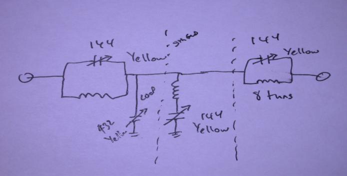 The 432MHz Band Pass tuned circuit consists of a loop of wire as shown below that is tuned with a Yellow "Phillips trimmer" that has a maximum capacitance of 10pF. The wire is approximately 20mm long and sits about 3mm above the ground plane. The 144MHz parallel and series tuned circuits are as above for the 144MHz filter. Placing some shields as depicted in the photographs below increases attenuation because of increased isolation from input to output.